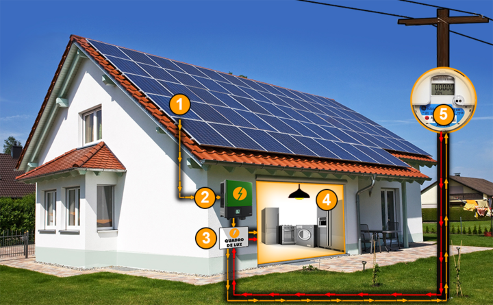 O excesso de eletricidade volta para a rede elétrica através do Medidor (Medidor bidirecional). Este aparelho mede a energia da rua que é consumida quando não há sol. A energia solar gerada em excesso quando há muito sol é injetada na rede da distribuidora. A energia solar que vai para a rede vira “créditos de energia”, para serem utilizados à noite ou nos próximos meses**